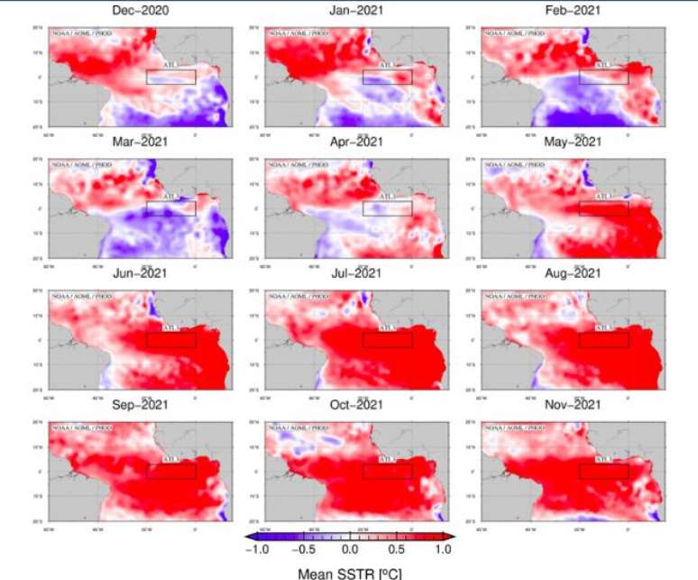 É importante mencionar que a diferença do final deste ano (2021) para o ano passado (2020) é a temperatura superficial da faixa Tropical sul do Oceano Atlântico (TSA), que está bem acima do normal neste final de 2021, se compararmos com o ano passado (no final de 2020 estava abaixo do normal).