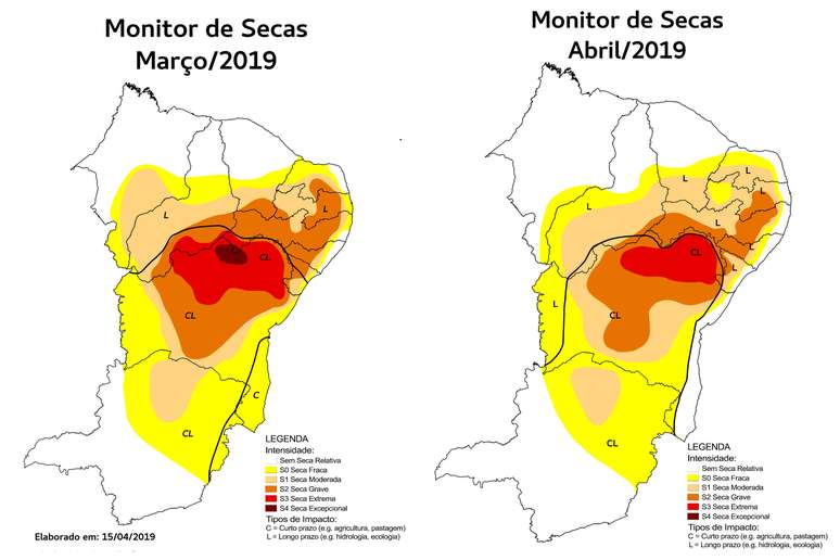 No comparativo com o mesmo período de 2018, a situação é um pouco melhor. Naquela situação, o Nordeste apresentava apenas 25,11% sem seca relativa, 11,64% em seca extrema e ainda 1,46% com seca excepcional, nível este não observado no mais recente mapa.