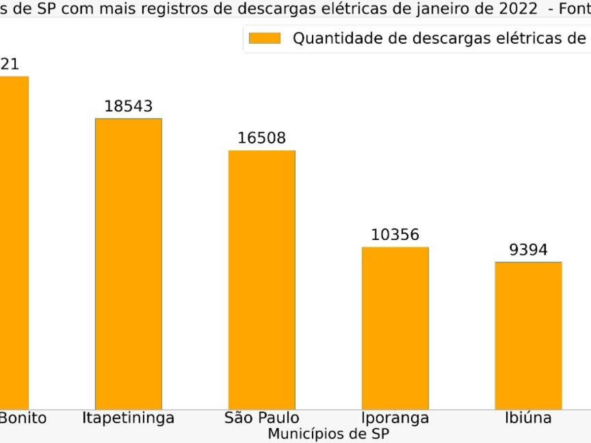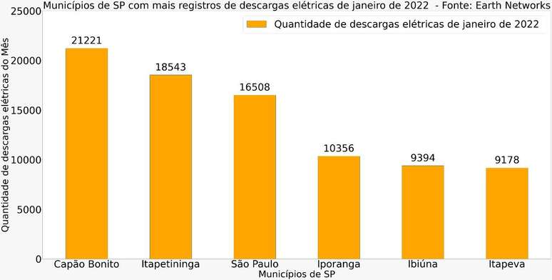Ainda de acordo com o Earth Network, o município do estado de São Paulo com mais raios neste mês de janeiro de 2022 (até o dia 20 de janeiro) foi Capão Bonito, com 21.221 raios. A Capital paulista ocupa a terceira posição, com registro de 16.508 raios.