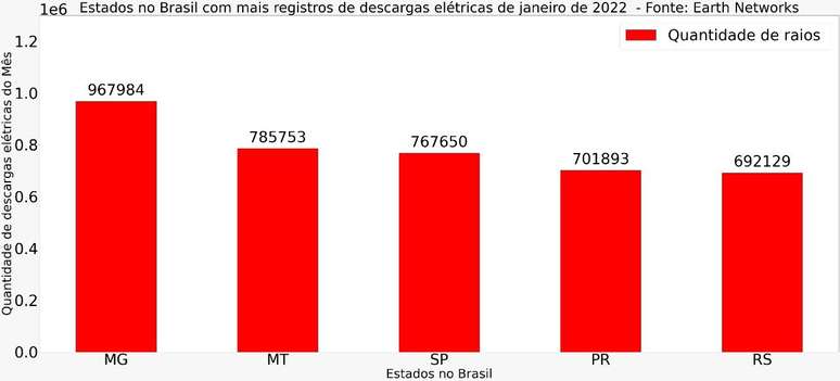 Apesar de Minas Gerais ser o estado com a maior quantidade de raios, a cidade de Corumbá, MS lidera como município brasileiro com mais registro de descargas elétricas nestes primeiros vinte dias de 2022, totalizando 87.011 raios.