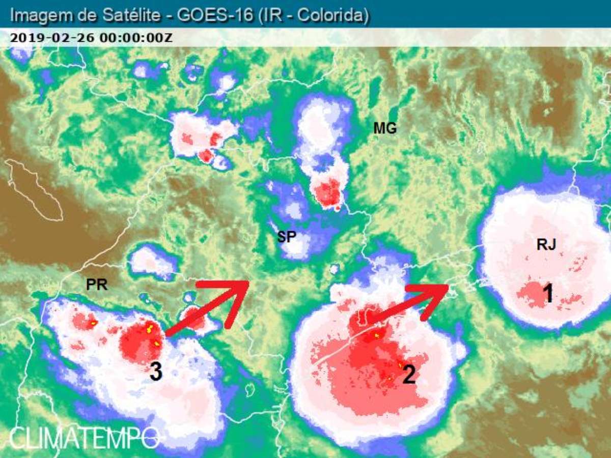 Porém, outra forte instabilidade (3 na imagem de satélite) avança do Paraná e vem trazendo mais temporais para São Paulo. A chuva desta nova instabilidade atinge cidades paulistas próximas da divisa com o Paraná ainda na noite da segunda-feira, 25. No decorrer da madrugada da terça-feira, 26, a instabilidade avança sobre o estado de São Paulo devendo provocar mais chuva também sobre a Grande São Paulo.Continua o alerta para temporais com rajadas de vento de 60 km/h a 80 km/h, risco de alagamentos e de raios.