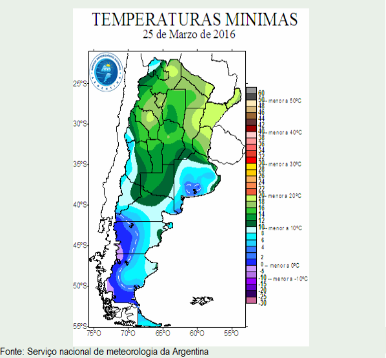 Nesta sexta-feira, 25, este centro de alta pressão polar (massa de ar polar) causou forte queda da temperatura sobre o centro-sul e leste da Argentina. Confira o mapa das temperaturas mínimas do serviço nacional de meteorologia da Argentina.