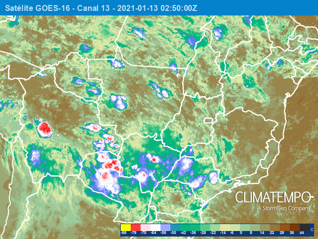 A animação de imagens captadas pelo satélite GOES - 16 mostra a evolução das nuvens de temporal na região de Corumbá. As nuvens com maior potencial para temporais aparecem em vermelho e em amarelo.