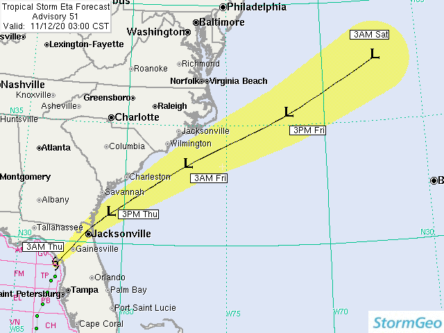 Eta está se movendo para nordeste a cerca de 20 km/h. A movimentação é pelo nordeste da Flórida nesta manhã de quinta-feira e seu deslocamento é em direção ao Atlântico ocidental durante a tarde. A Estação de Observação Marítima Costeira NOAA em St. Augustine, Florida relatou recentemente ventos sustentados de 59 km/h e uma rajada de 70 km/h.