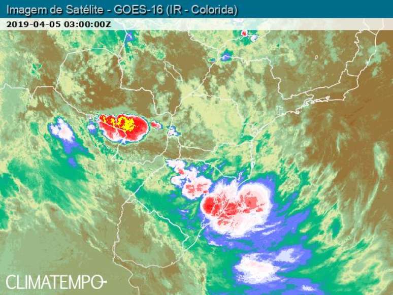 Nuvens muito carregadas (manchas vermelhas e amarelas) se espalham sobre o Sul do BR