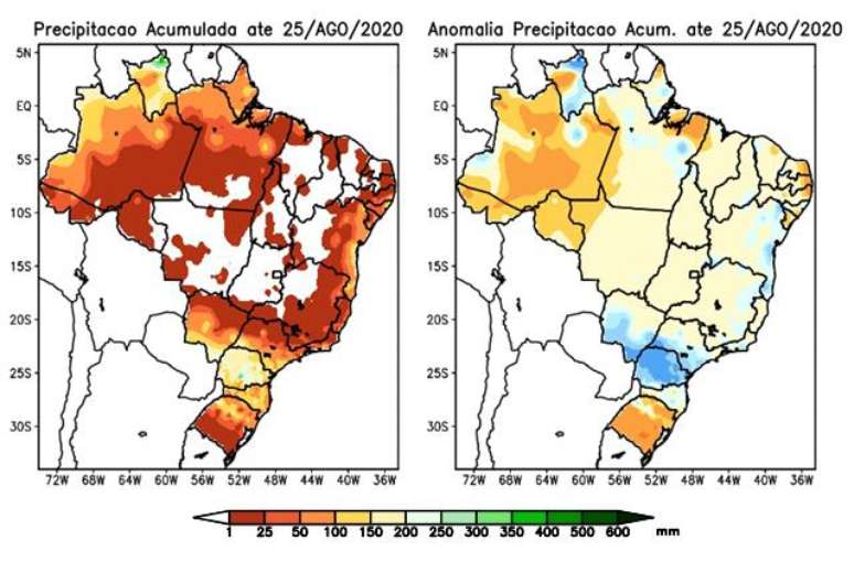 Por outro lado, se observarmos na imagem acima o comportamento da chuva até agora em Santa Catarina e no Paraná, já é possível notar que os efeitos da seca na Região Sul diminuíram. Com a chuva observada até 25/08, os acumulados ficaram acima da média no Paraná e próximos da média mensal em Santa Catarina.