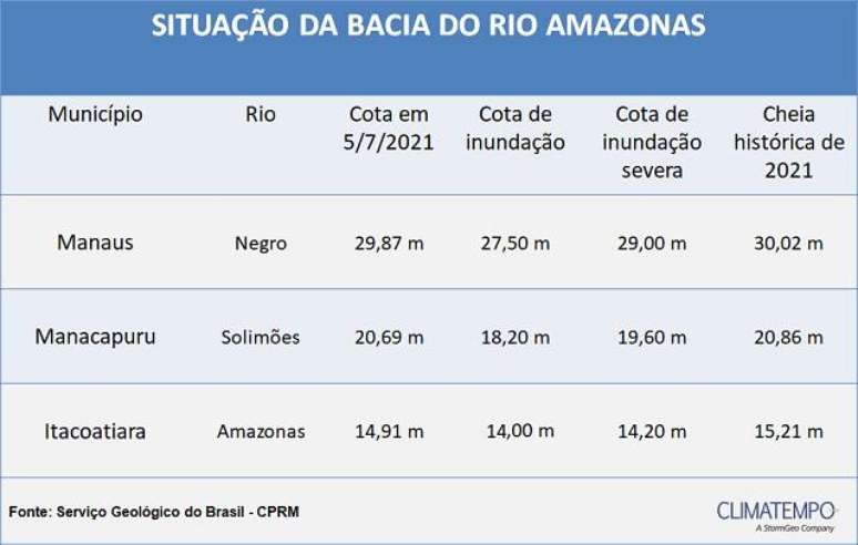 A vazante é lenta e gradual e os efeitos da inundação não se encerram logo que o rio começa a descer. Confira o nível dos rios, Segundo dados oficiais do Serviço Geológico do Brasil - CPRM, no dia 5 de julho de 2021: o rio Negro estava em 29,87 m em Manaus. O nível do rio Solimões, em Manacapuru (AM), era de 20,69 m, sendo que o pico foi de 20,86 m. Em Itacoatiara (AM), o rio Amazonas atingiu o pico da cheia de 2021 no dia 31 de maio, com 15,21 m, e em 5 de julho estava com em 14,91 m.