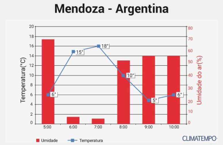 Confira no gráfico a seguir a evolução da temperatura e da umidade do ar entre as 05h e as 10h da manhã do dia 15 de julho de 2017 no aeroporto de Mendoza.