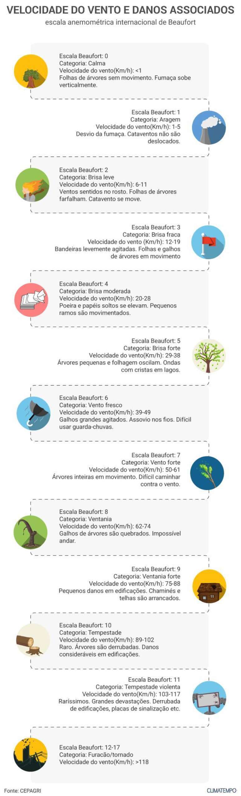 Veja como é a estimativa da velocidade do vento através dos danos causados em superfície e do estado do mar.