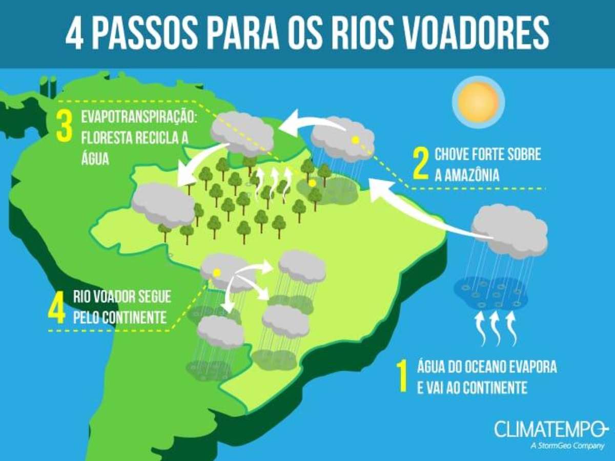 Os rios voadores são, como o nome sugere, fluxos de vapor de água invisíveis, que podem transportar mais água que o próprio rio Amazonas. Boa parte das chuvas que chegam à região Sudeste do Brasil vem da Amazônia que, inclusive, produz umidade que gera chuvas até mesmo em outros países da América do Sul, como Uruguai e Paraguai.