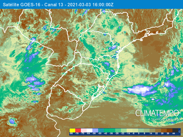 Na animação das imagens captadas pelo satélite GOES 16 estas nuvens aparecem como manchas em tons de azul. As áreas em azul claro indicam as nuvens com maior potencial para provocar chuva moderada a forte e com rajadas de vento.
