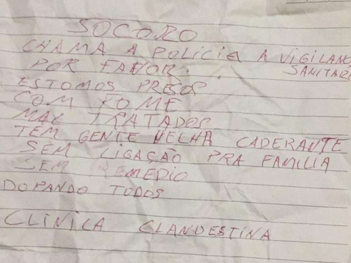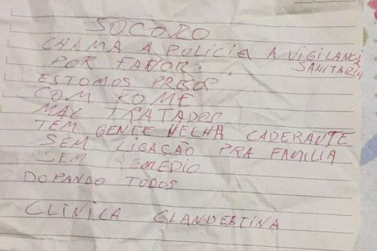No bilhete, que estava envolto em uma pedra, um dos pacientes escreveu: "Socorro, chama a polícia e a vigilância sanitária, por favor. Estamos presos, com fome." A mensagem foi encontrada por uma pessoa que passava pelo local e denunciou o caso à Polícia Civil. Durante a operação de interdição, três indivíduos foram detidos, incluindo dois supostos proprietários da clínica, que alegadamente acolhia dependentes químicos, e um segurança.