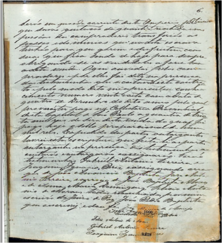 Segundo a escritura, Siqueira compareceu à "Collectoria Provincial desta Capital de S. Paulo e pagou a quantia de sessenta mil reis de sisa desta venda". Sisa era um imposto calculado especificamente para "transmissão inter vivos", ou seja, a compra de mão de obra humana.