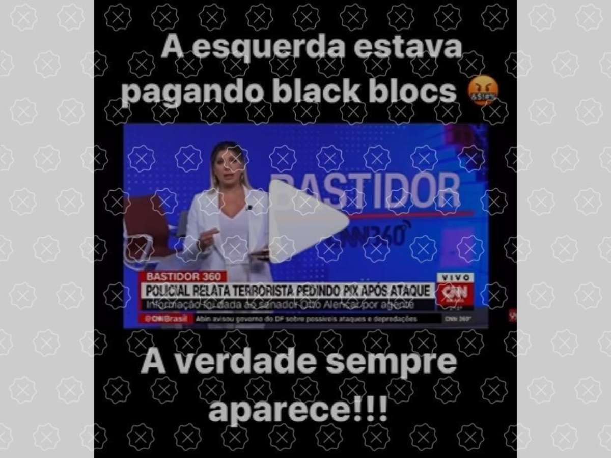 É mentira que a CNN Brasil noticiou que a esquerda pagou black blocs para quebrarem Brasília no domingo (8), como fazem crer publicações nas redes sociais. No trecho compartilhado com a falsa descrição, a jornalista Daniela Lima cita uma conversa que teve com um senador sobre os bastidores da depredação das sedes dos Três Poderes. Segundo o relato, um agente da Polícia Legislativa afirmou ter testemunhado um vândalo fazendo pedido de Pix, o que reforçaria a suspeita de que golpistas foram financiados. Em nenhum momento movimentos ou partidos de esquerda são citados.