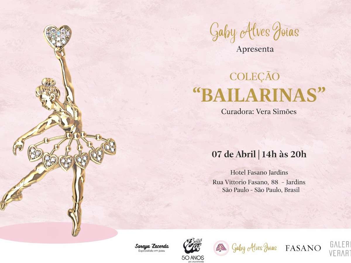 Gaby Alves, artista visual e joalheira, lança a coleção de joias "Bailarinas" no dia 7 de abril, no Hotel Fasano Jardins, em São Paulo, das 14h às 20h. A curadoria é de Vera Simões. O evento apresenta peças inspiradas no ballet, no bordado e na ilustração, com utilização de metais e pedras.