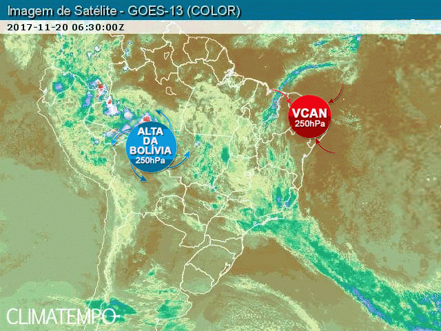 Animação de imagens de satélite mostra a presença da ZCAS sobre o Brasil em 20/11/17