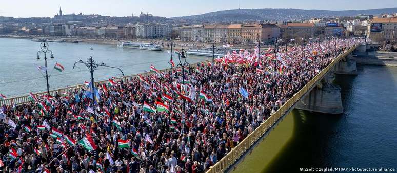 Mobilização nas ruas eleva polarização no país antes de pleito marcado por acusações de interferência estrangeira. Premiê húngaro acusa o rival de colaborar com a Ucrânia; oposição aponta campanha russa pró-Orbán.Milhares de pessoas participaram neste domingo (15/03) de marchas rivais organizadas pelo primeiro‑ministro húngaro Viktor Orbán e seu principal opositor, Peter Magyar, em Budapeste. Ambos impulsionam acusações de interferência estrangeira a um mês das eleições parlamentares do país.