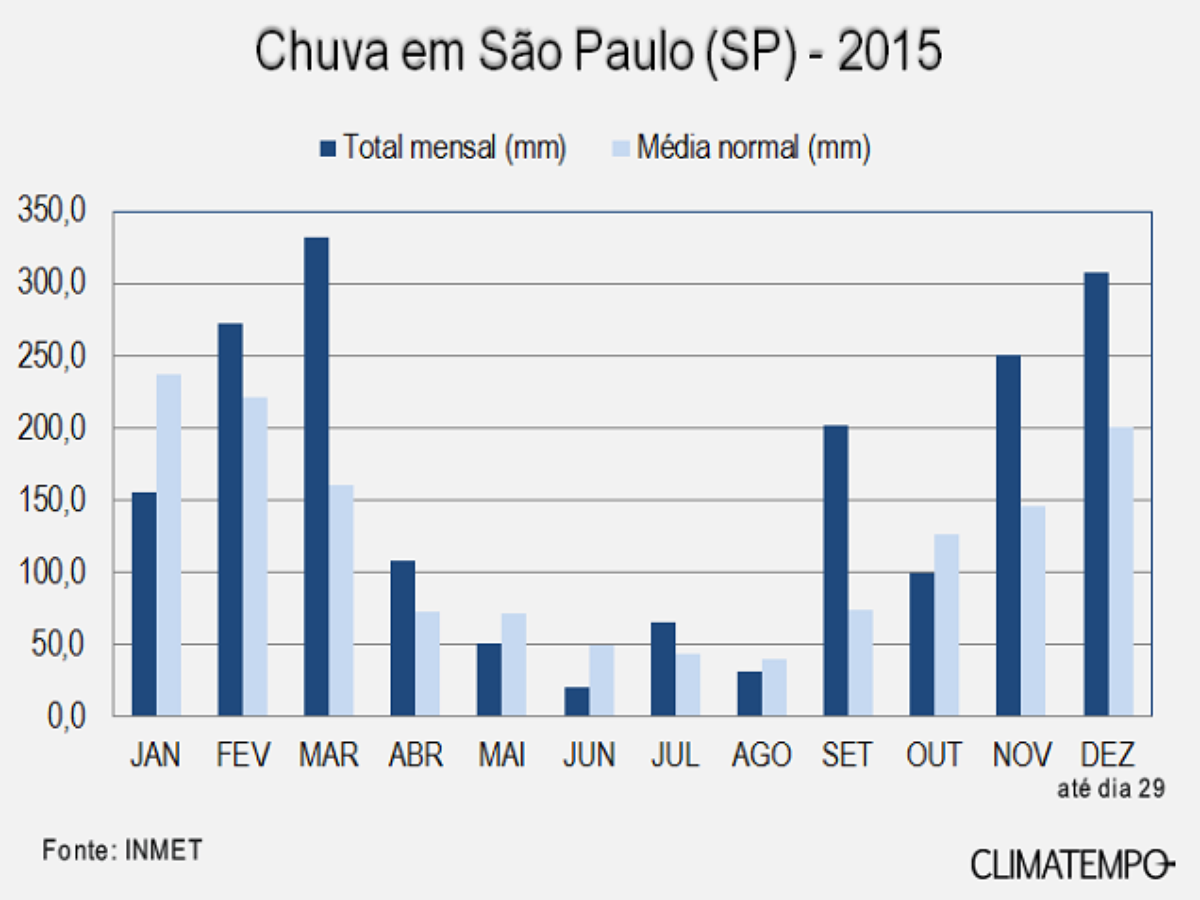 Segundo o Instituto Nacional de Meteorologia, janeiro de 2015 foi o janeiro com menor acumulado de chuva desde 2001. Na estação meteorológica do Mirante de Santana, na zona norte da capital, que faz medições regulares desde 1943, o total de chuva em janeiro de 2015 foi de 156,2 mm.