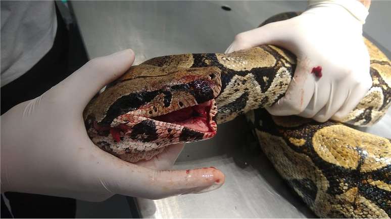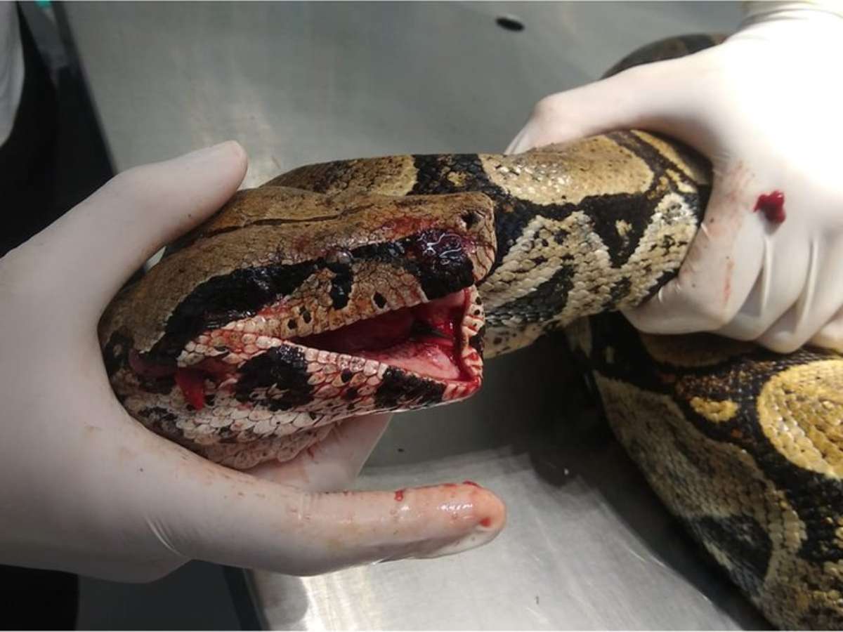 Segundo o diretor do Vida Livre, Roched Seba, a serpente chegou com diversas fraturas e ferimentos na cabeça e em estado grave.