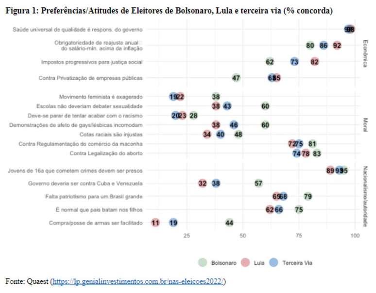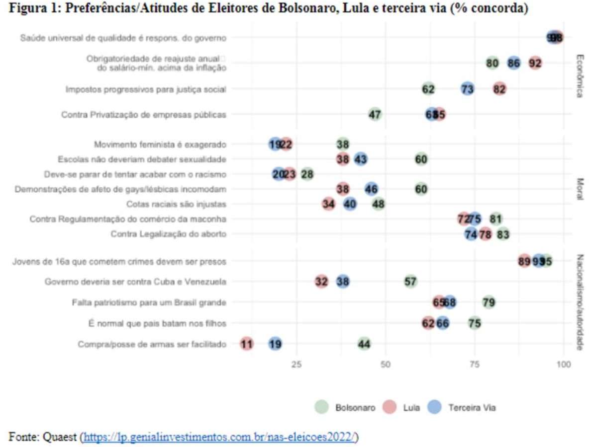 Onde se observa maior discrepância de preferências é em relação à pauta nacionalismo/autoridade, quando eleitores bolsonaristas defendem maior patriotismo e oposição aos governos de Cuba e Venezuela. Mas, mesmo entre temas que sugerem maior afinidade do eleitor com resoluções violentas de seus conflitos, como por exemplo a "facilitação da compra e uso de armas de fogo", o que se verifica é que, embora os eleitores de Bolsonaro sejam mais favoráveis do que os de Lula e os da terceira via (44%, 11% e 19%, respectivamente), essa não é a preferência da maioria dos eleitores de Bolsonaro.