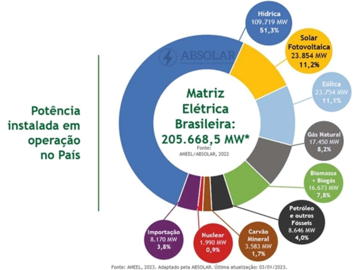 As perspectivas para geração e utilização de energia limpa no Brasil são imensas, especialmente considerando novos modelos de sustentabilidade que conciliem a qualidade de vida com o desenvolvimento econômico. De acordo com a Matriz Elétrica Brasileira, divulgada pela ABSOLAR Associação Brasileira de Energia Solar Fotovoltaica, baseada em dados da ANEEL Agência Nacional de Energia Elétrica, em janeiro de 2023, a potência instalada em operação no país tem sua origem em 81,4% de fontes renováveis. A participação é liderada pela geração hidráulica, com 51,3%, seguida pela solar fotovoltaica, com 11,2%, eólica, com 11,1%, biomassa e biogás, com 7,8%.