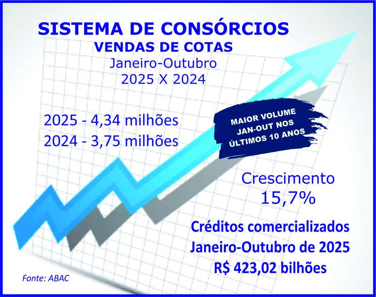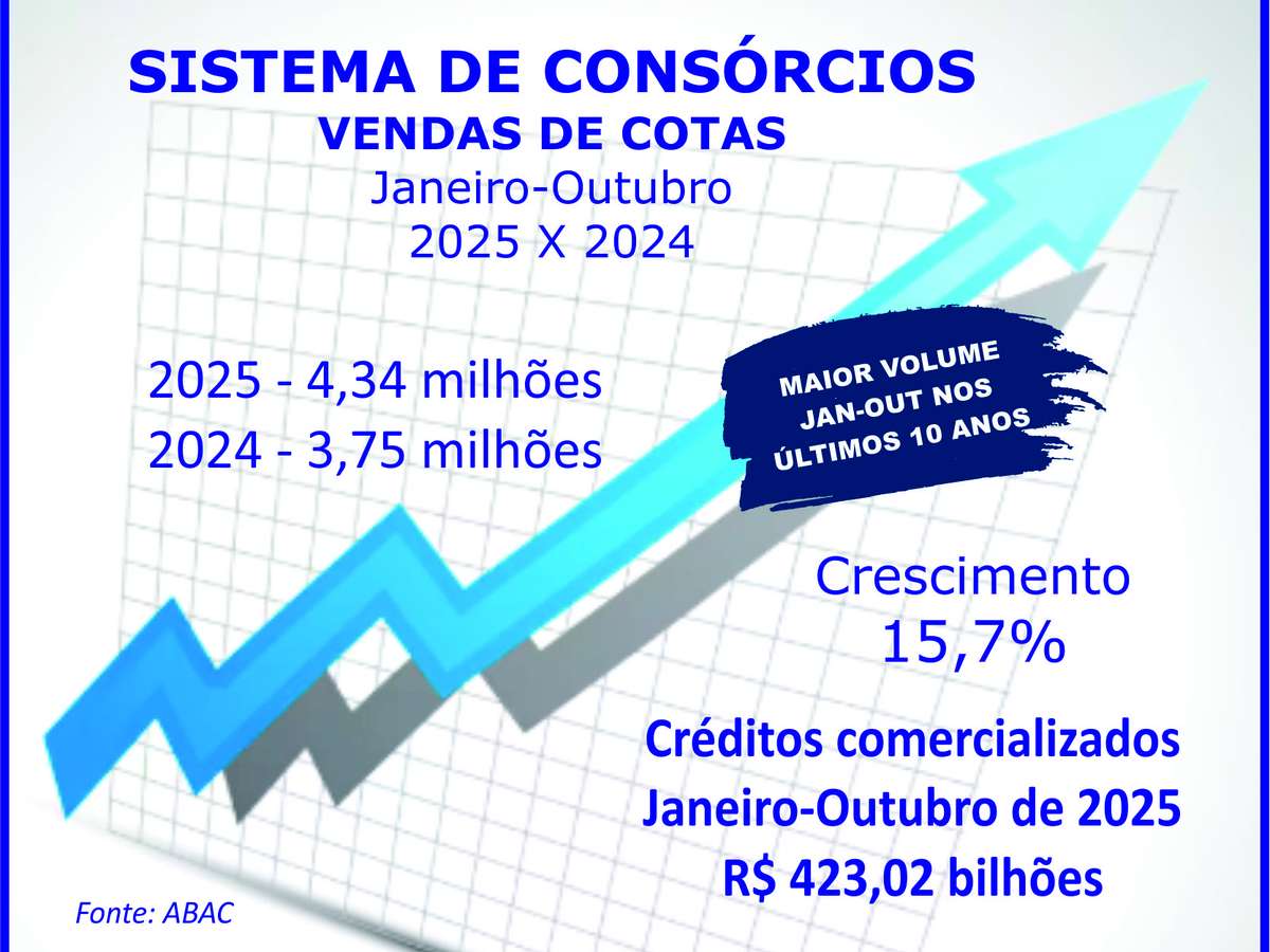 Ao encerrar o décimo mês do ano, o sistema de consórcios voltou a superar marcas anteriores ao alcançar 4,34 milhões de cotas vendidas no acumulado de janeiro a outubro. Com 15,7% mais que as 3,75 milhões totalizadas no mesmo período de 2024, as adesões quebraram um recorde histórico da modalidade.