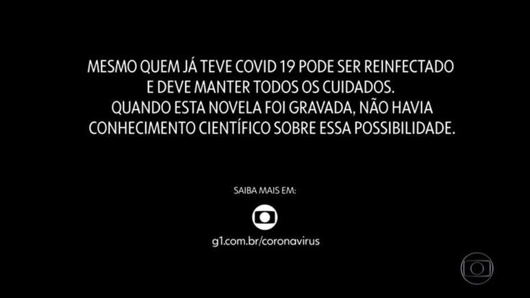 Diante das críticas, a Globo se viu obrigada a exibir um disclaimer ao final de cada capítulo. Desde o dia 19, um aviso surge na tela sempre que a trama termina: "Mesmo quem já teve covid-19 pode ser reinfectado e deve manter todos os cuidados. Quando esta novela foi gravada, não havia conhecimento científico sobre essa possibilidade".