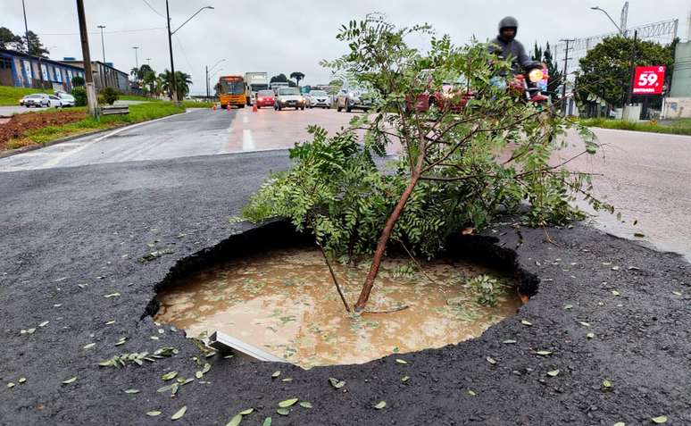 Neste domingo, um vídeo feito por uma pessoa que passava pela região mostrou que vários veículos estavam parados logo à frente do buraco. Uma equipe da Polícia Rodoviária Federal (PRF) já estava no local.