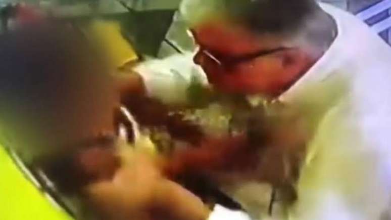 Em um ato de brutalidade, o menino cai e é levantado pelo agressor, que o arremessa contra a parede. O corpo da criança fica preso enquanto o homem a sacode repetidamente e, em seguida, joga o menino ao chão.