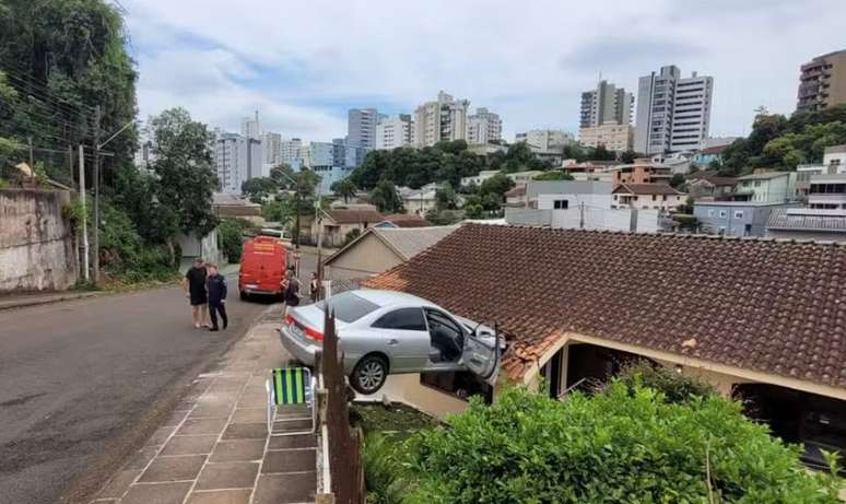 Um carro com uma criança de aproximadamente seis anos sozinha em seu interior desceu descontroladamente uma rua íngreme e ficou suspenso após colidir com uma residência em Erechim. O incidente ocorreu na manhã deste sábado (15) na Rua Assis Brasil.
