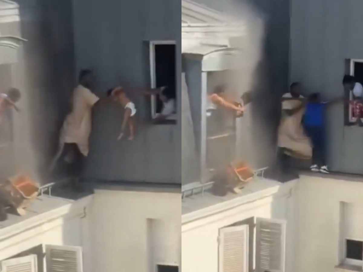 Um vídeo que circula pelas redes sociais mostra o momento em que Fousseynou Samba pula de uma janela do sexto andar do edifício e anda por um beiral estreito até chegar próximo de uma janela de onde saía fumaça.