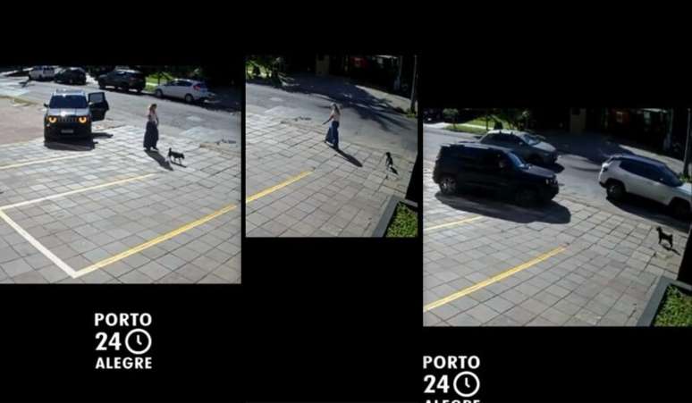 Ela para o veículo no meio da calçada, desce do carro, pega o cachorrinho no banco de trás e sai com ele. A porta do carro fica aberta, e alguém dentro do veículo fecha. Segundos depois, ela reaparece nas imagens, o cachorro aparece preso e ela entra no veículo e vai embora.