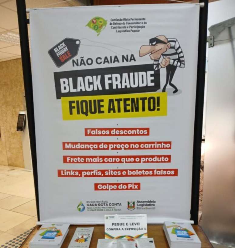 A Comissão de Defesa do Consumidor presidida pelo Deputado Dr Thiago está alertando para os golpes no comércio nesta semana da promoção Black Friday. Para chamar atenção, foi instalada uma exposição com banners no espaço Deputado Carlos Santos, na Assembleia Legislativa. Os cartazes alertam sobre os falsos descontos, mudança de preço no carrinho, frete mais caro que o produto, links e boletos falsos e o golpe do Pix.