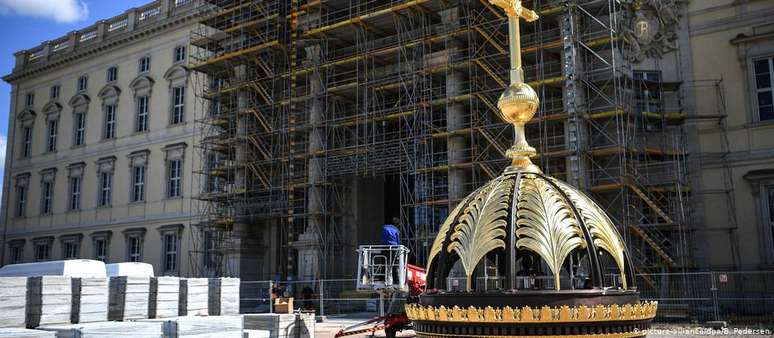 Abóbada colocada em local que está sendo reconstruído traz inscrição e símbolos com referências ao cristianismo e ao colonialismo. Prédio abrigará Fórum Humboldt, museu que terá peças da Ásia, África, Américas e Oceania.Uma controversa cúpula com referências ao cristianismo e ao imperialismo prussiano deve ser colocada nesta sexta-feira (29/05) no topo do Palácio da Cidade de Berlim (Berliner Stadtschloss), numa das últimas etapas da obra de reconstrução do edifício que abrigará o Fórum Humboldt, um museu que contará com artefatos da Ásia, África, Américas e Oceania.
