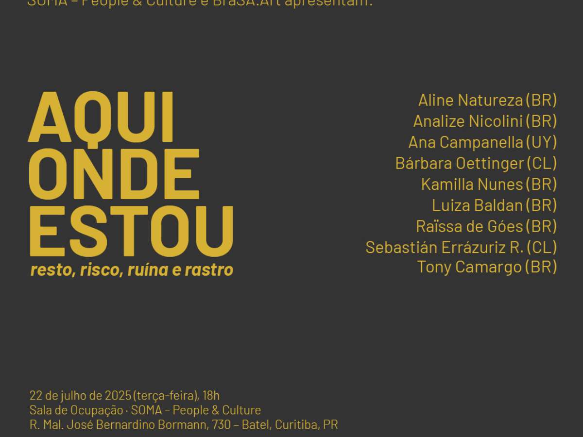 A SOMA - People & Culture, em Curitiba, apresenta de julho a setembro de 2025 a exposição coletiva internacional AQUI ONDE ESTOU - resto, risco, ruína e rastro. Com curadoria da artista e curadora Analize Nicolini e produção da BraSA.Art, o projeto inaugura sua ocupação artística e curatorial permanente na instituição. A mostra reúne obras de nove artistas do Brasil, Chile e Uruguai em mídias como vídeo, cerâmica, néon e fotografia.