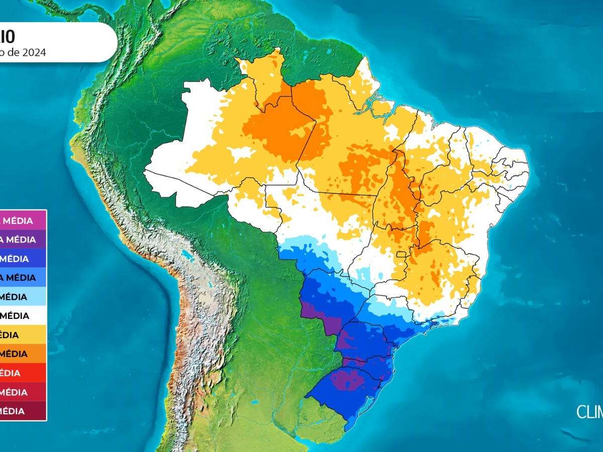 Os mapas de temperatura já indicam essa mudança. Nas áreas destacadas em azul, as temperaturas entre sexta e terça-feira da semana que vem deverão ficar entre 3°C e 5°C abaixo da média para o mês de agosto. Já nas regiões em roxo, que incluem grande parte do oeste do Rio Grande do Sul, oeste de Santa Catarina, oeste do Paraná e o sul de Mato Grosso do Sul, as temperaturas poderão variar entre 5°C e 7°C abaixo do normal para o período, sinalizando um retorno marcante do frio após dias de calor.