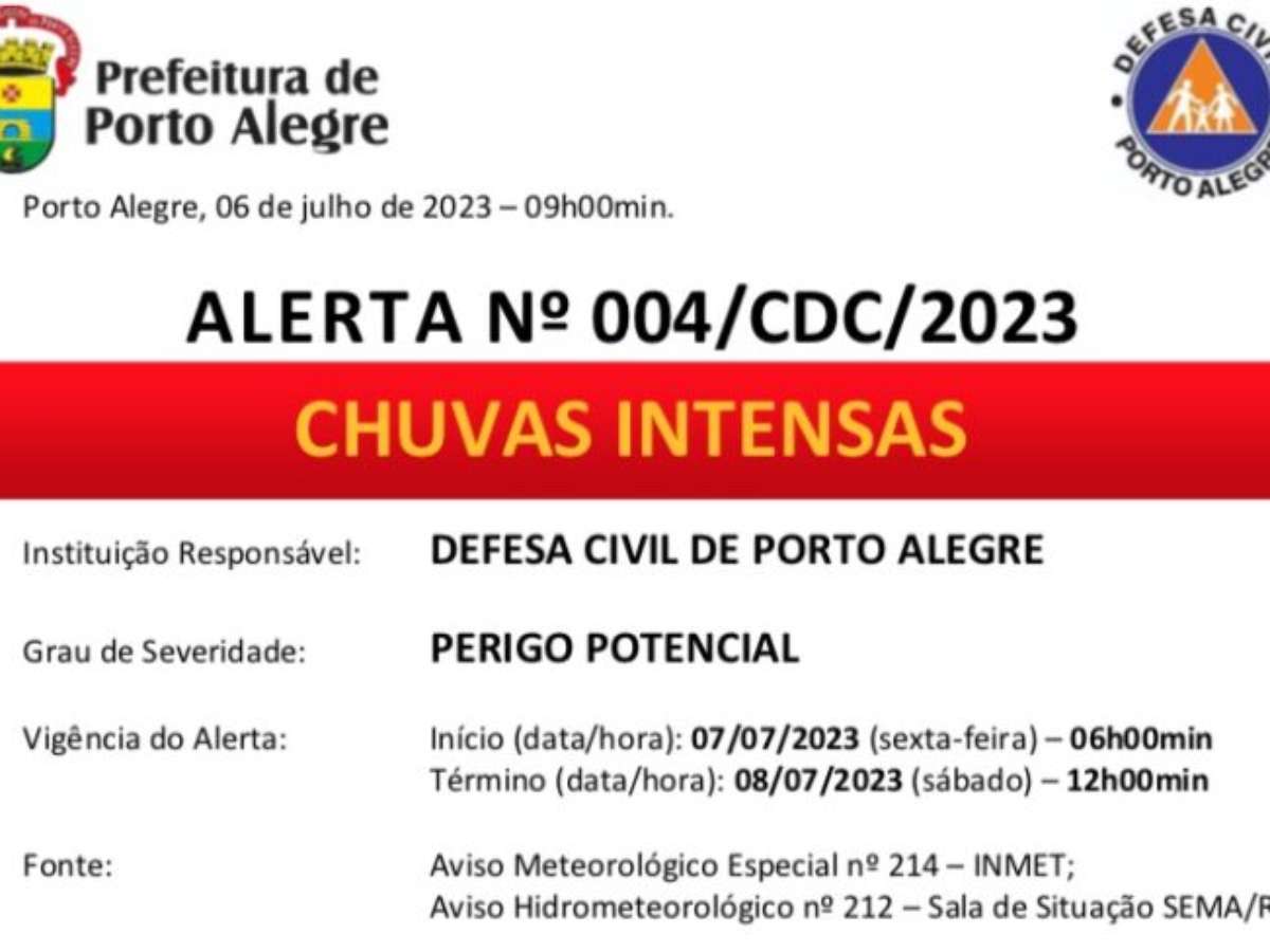 A Defesa Civil de Porto Alegre, com base nas informações publicadas por órgãos oficiais de meteorologia, ALERTA para a formação de uma frente fria que dará origem a um ciclone extratropical próximo ao litoral do RS. Com isso, as condições meteorológicas estarão favoráveis a ocorrência de chuvas intensas com acumulados até 150mm, rajadas de vento entre 40 e 60Km/h, trovoadas e queda de granizo, durante a vigência deste comunicado. Há risco de queda de vegetais, corte de energia elétrica, alagamentos, enxurradas, deslizamentos de terra e transtornos a mobilidade urbana.