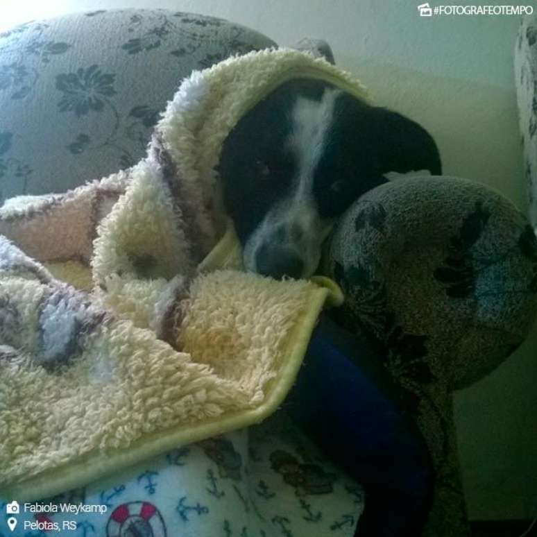Este é Tom Jobim, o cachorro da Fabiola, que mora em , no sul do Rio Grande do Sul, quase no litoral. Ele é a imagem do “frio de renguear cusco”. Com tanto frio que tem feito por lá nos últimos dois dias, Tom Jobim se encolheu mesmo nos cobertores. O aeroporto de Pelotas registrou 7°C nesta quinta-feira e na tarde de quarta o termômetro não passou dos 15°C.