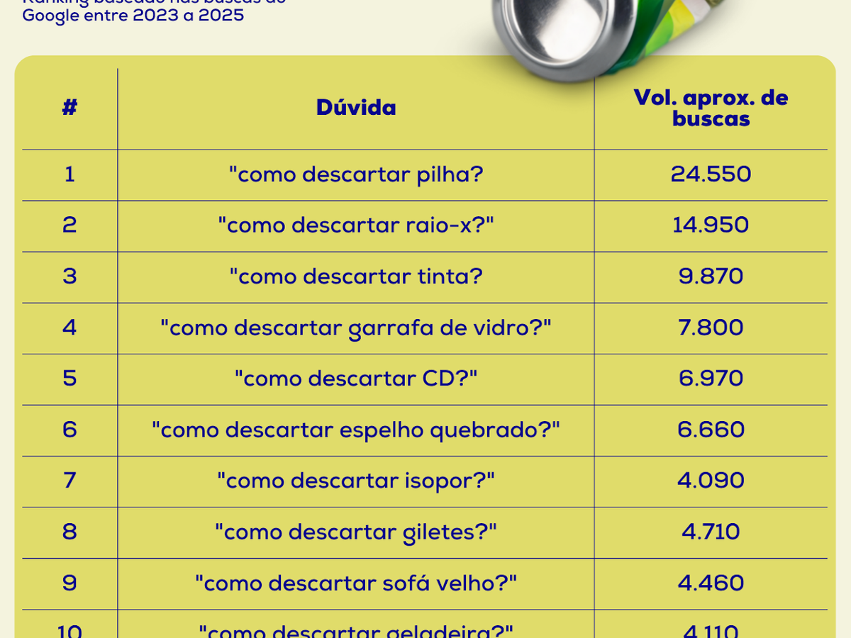 Com 35% das pesquisas on-line, a categoria de eletrônicos e eletrodomésticos lidera as dúvidas da população na internet, totalizando cerca de 120.274 buscas entre 2023 e 2025. Entre os itens mais procurados para descarte adequado estão pilhas e baterias, CDs e DVDs, geladeiras, celulares e acessórios. Lojas de eletrônicos, ecopontos e cooperativas de reciclagem são os destinos mais recomendados para esses objetos.