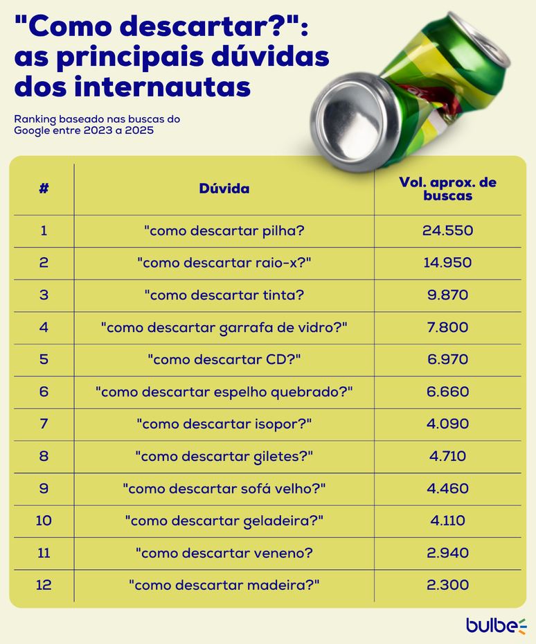 Essa realidade evidencia não apenas desafios estruturais, mas também a falta de informação sobre o descarte correto de resíduos. A fim de entender melhor essa lacuna, a Bulbe Energia, plataforma de energia solar por assinatura, realizou um levantamento das principais dúvidas pesquisadas no Google sobre o tema. Os dados revelam que, nos últimos dois anos, as buscas pelo termo "como descartar" cresceram 84%. Dessa forma, geraram mais de 300 mil pesquisas relacionadas a diferentes tipos de resíduos.
