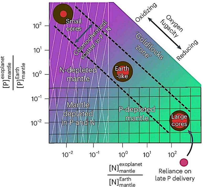 Para exemplificar isso, os pesquisadores criaram uma figura (abaixo) que mostra a dispersão esperada nas proporções de fósforo (P) e nitrogênio (N) que acabam ficando disponíveis no manto dos exoplanetas, porque nem todos os sistemas estelares formam planetas com a mesma composição.