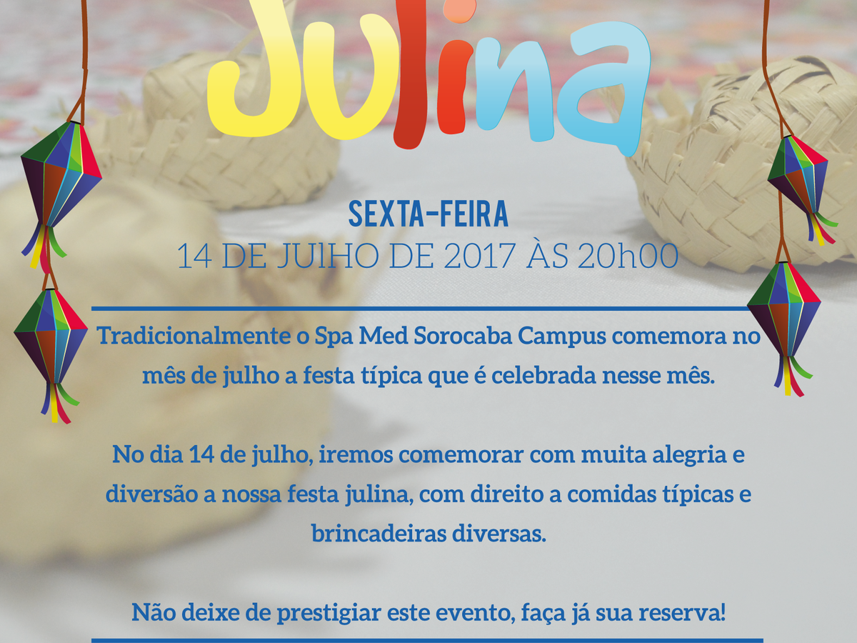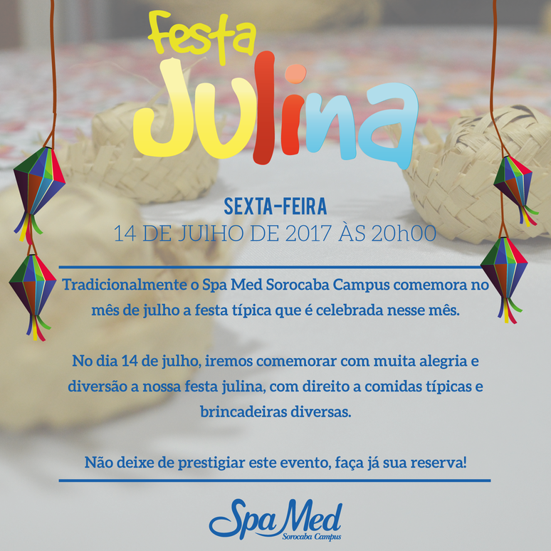 Na próxima sexta-feira, dia 14 de julho, o Spa Med Sorocaba Campus promove sua tradicional festa julina com direito a comidas típicas e brincadeiras diversas.