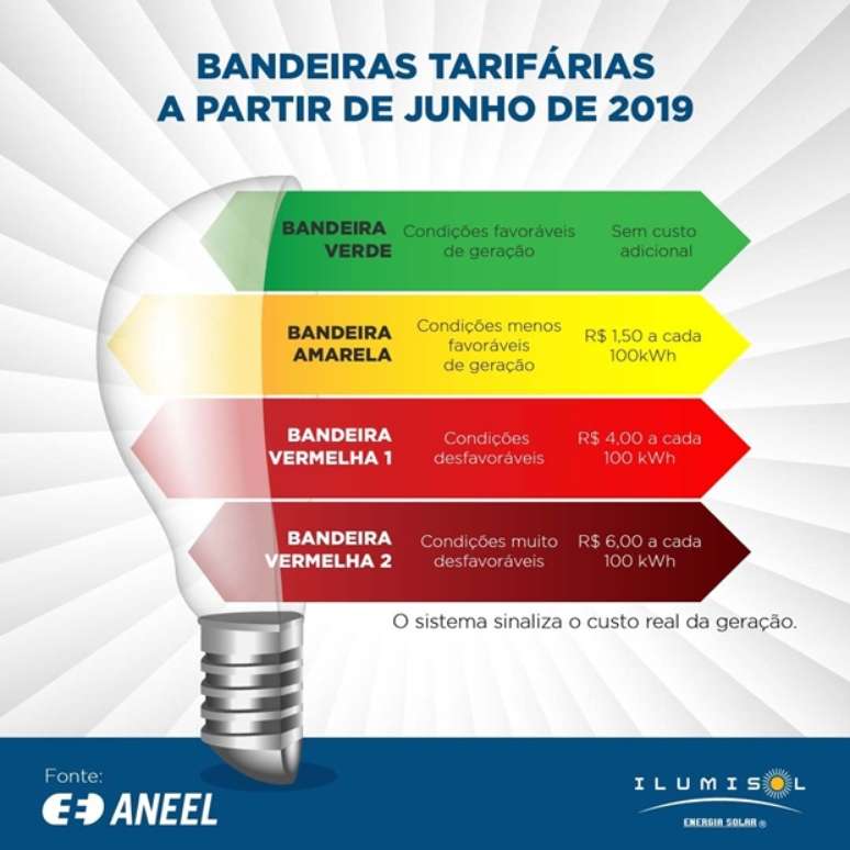 A bandeira tarifária adotada pela Agência é determinada pelas condições do nível dos reservatórios. Sendo a bandeira verde para quando tem o nível máximo nos reservatórios completo, e no período de estiagem quando os níveis de água diminuem e então a geração da energia fica mais cara, determinando assim o uso das bandeiras amarelas e vermelhas na conta de luz dos consumidores. Com a alta nas tarifas, o consumidor já começa a se precaver com a redução da energia elétrica em sua casa, comércio e propriedade. Os clientes que utilizam o sistema de energia fotovoltaico confirmam os benefícios e a economia que é possível através da geração de energia solar.