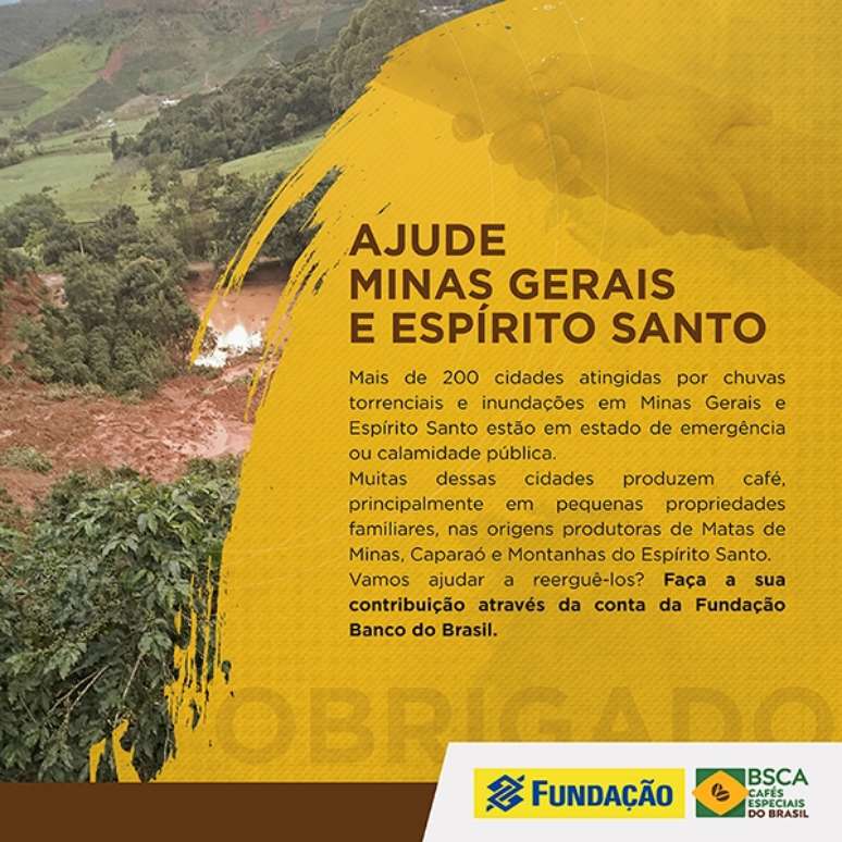 A Associação Brasileira de Cafés Especiais (BSCA) adota uma iniciativa solidária e apoiará a Fundação Banco do Brasil a auxiliar quem sempre contribuiu para a imagem dos cafés sustentáveis e especiais do país. Por meio dessa parceria, a entidade lançará uma campanha de arrecadação de recursos no Brasil e no exterior para os moradores de cidades cafeeiras, de Minas Gerais e Espírito Santo, que se encontram em estado de emergência ou calamidade pública devido às recentes enchentes.