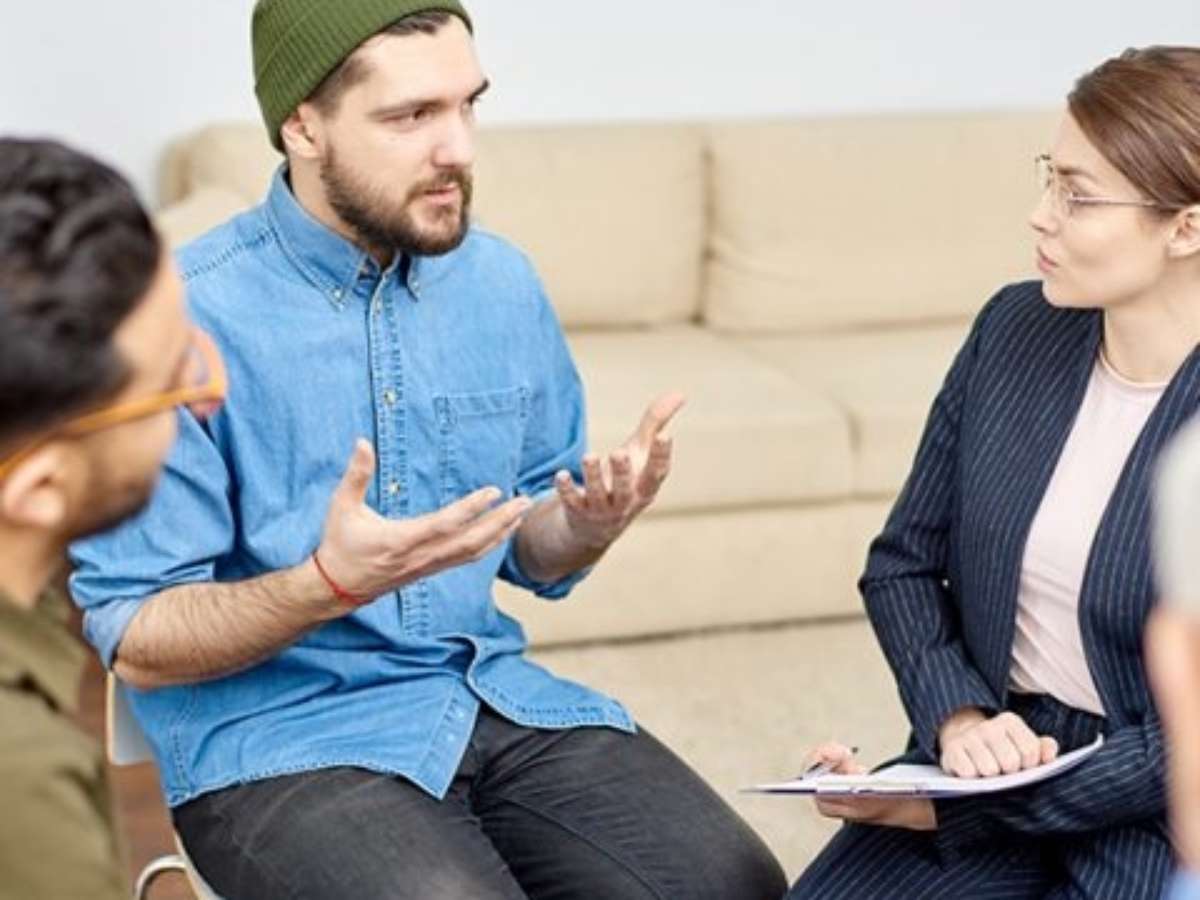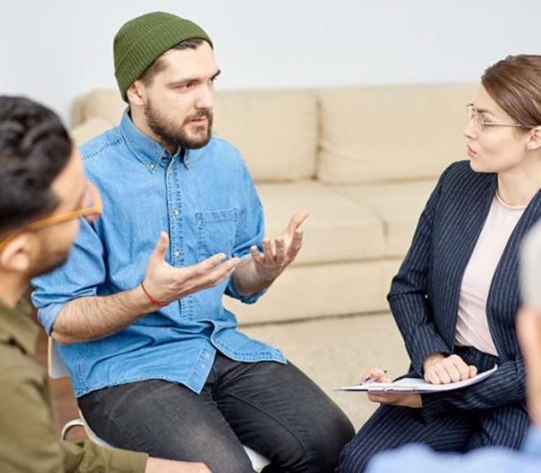 Terapia em grupo: onde um profissional supervisiona a conversa entre os pacientes e estes trocam experiências entre si.