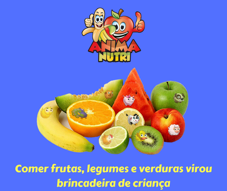 A proposta do Anima Nutri é introduzir no cardápio da criançada frutas, legumes e verduras de forma natural e divertida. A empresa produz figurinhas divertidas, com zero caloria e sem glúten que aderem ao alimento e incentivam a criança a ter uma alimentação saudável, consumindo frutas, legumes e verduras que muitas vezes elas se recusam a consumir.