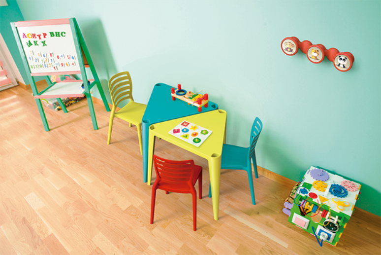 5- Estimular a criatividade dos pequenos com quadros, lousas e rolos de papel nas paredes. Mesas e cadeiras infantis com lápis de cera e cartolina são ótimos para atividades artísticas.