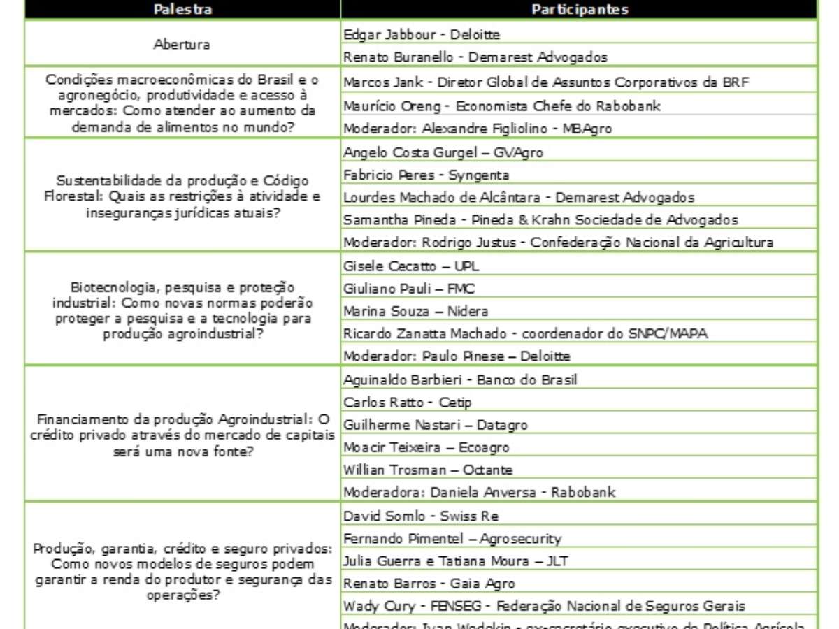 Nomes como Marcos Jank da BRF; Rodrigo Justos da CNA; Marina Souza, da Nidera; Carlos Ratto da Cetip; e Ricardo Zanatta Machado, do MAPA, se reunirão a outros representantes do agronegócio brasileiro para debater temas como a sustentabilidade da produção, os instrumentos de crédito, os novos modelos de seguro para garantir a renda do produtor e os possíveis modos de atender o aumento da demanda de alimentos no mundo.