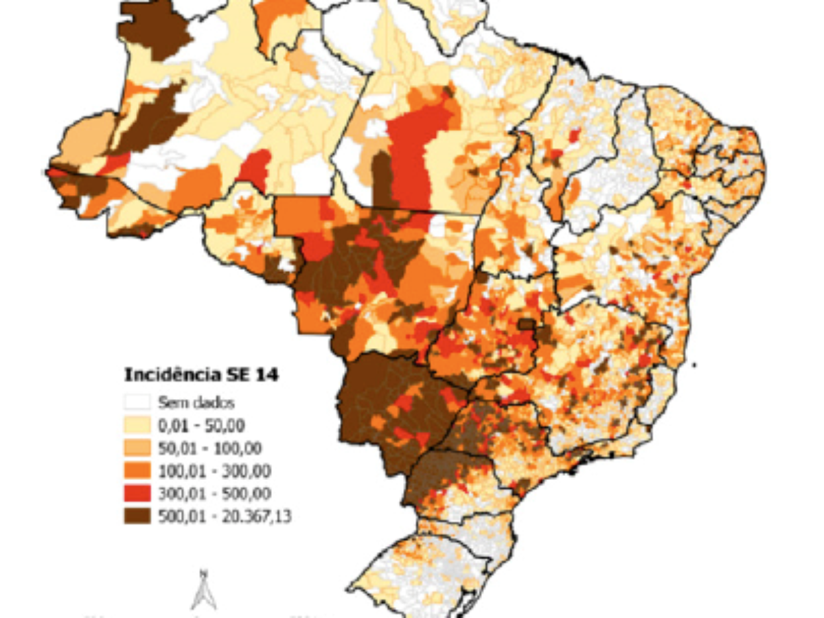 No mapa oficial em laranja estão assinaladas cidades em situação pré-epidêmica; em vermelho e marrom, aquelas em epidemia e severa epidemia, respectivamente.