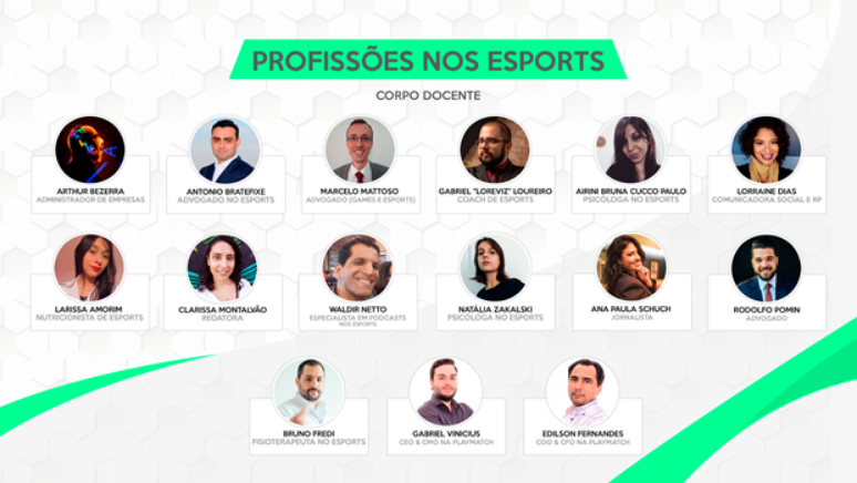Para o lançamento, previsto neste mês de agosto, o curso contará com aulas, cases e depoimentos de diversos profissionais relevantes dos Esports no Brasil, sendo eles: Clarissa Montalvão (Redatora Chefe do Multiverso+), Gabriel Loreviz (analista da LOUD), Ana Paula Schuch (jornalista do Multiverso+), Lorraine Dias (relações públicas do Multiverso+), Natalia Zakalski (psicóloga da Prodigy Esports), Airini Bruna (psicóloga da Redemption e W7M), Bruno Fredi (fisioterapeuta da INTZ), Larissa Amorim (nutricionista atuante nos Esports), Rodolfo Pomin, Marcelo Mattoso e Antonio Bratefixe (advogados atuantes nos Esports), Arthur Bezerra (administrador de empresas), Waldir Netto (professor e especialista em podcasts de Esports), Edilson Fernandes (COO & CFO da PlayMatch) e Gabriel Vinicius (CEO & CMO da PlayMatch).